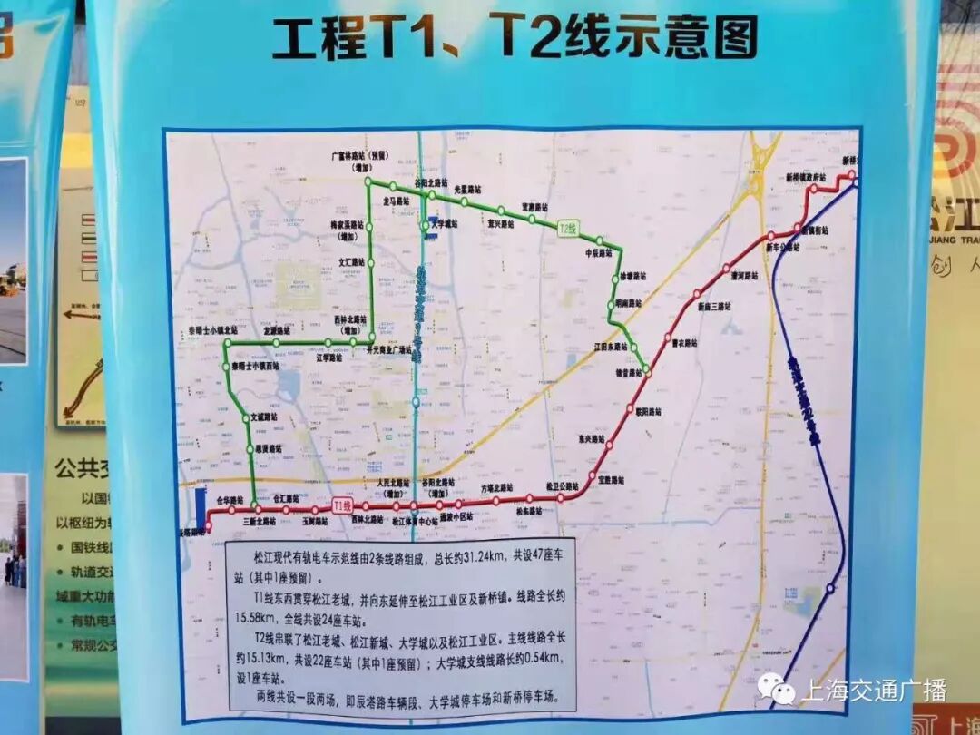 松江有軌電車示范線工程T1、T2線總長約31.24km,共設47座車站。T1線東西貫穿松江老城,并向東延伸至松江工業區及新橋鎮。T2線串聯了松江老城、松江新城、大學城以及松江工業區。